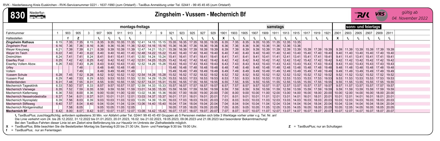 830 RVK TaxiBusPlus (außer im Schülerverkehr): (Zingsheim –) Weyer – Dreimühlen – Eiserfey – (Urfey – Vollem –) Vussem – Breitenbenden – Mechernich Stiftsweg – Mechernich Bf
