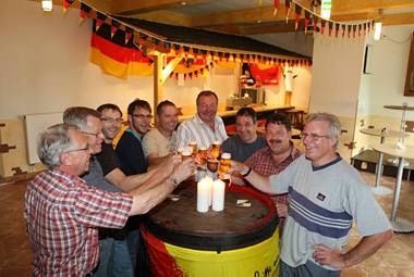 Im neu hergerichteten Schankraum der ehemaligen Schule in Weyer stoßen die Mitglieder des Vereinskartells um Vorsitzenden Björn Wassong (4. v.li.) auf die bislang geleistete Arbeit an. (Foto: Hilgers)