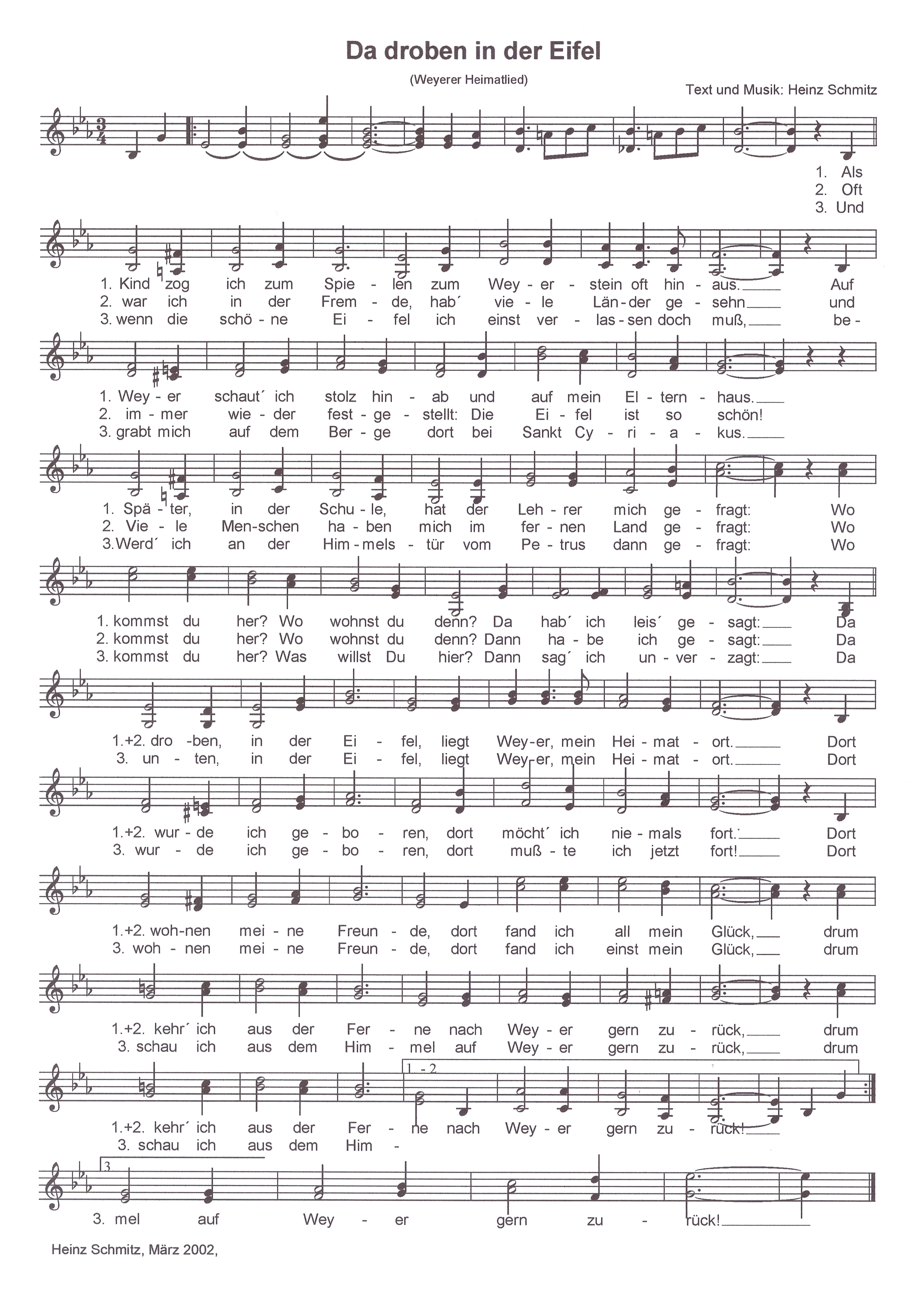 In dieser Tradition steht auch das Weyerer Heimatlied "Da droben in der Eifel" – ein besonderes musikalisches Zeugnis unserer Dorfgeschichte. Noch ist es vor allem den älteren Weyererinnen und Weyeren vertraut, die es bei Festen, Zusammenkünften und kleinen wie großen Anlässen gesungen haben. Doch dieses Lied verdient es, weitergegeben und von kommenden Generationen neu entdeckt zu werden.