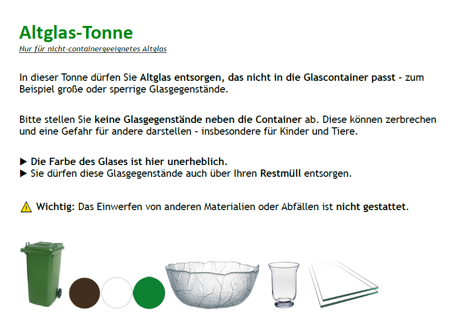 Eine sinnvolle Ergänzung: Neben den Containern wurde ein grün markierter Mülleimer aufgestellt. Dieser ist ausdrücklich dafür gedacht, größere Glasreste aufzunehmen, die nicht in die Container passen. In der Vergangenheit wurden solche Gegenstände häufig einfach daneben abgestellt – mit der Folge, dass sie zerbrachen und über lange Zeit gefährliche Scherben die Umgebung verunreinigten. - Diese dürfen auch im eigenen Restmüll (Graue Tonne) entsorgt werden.