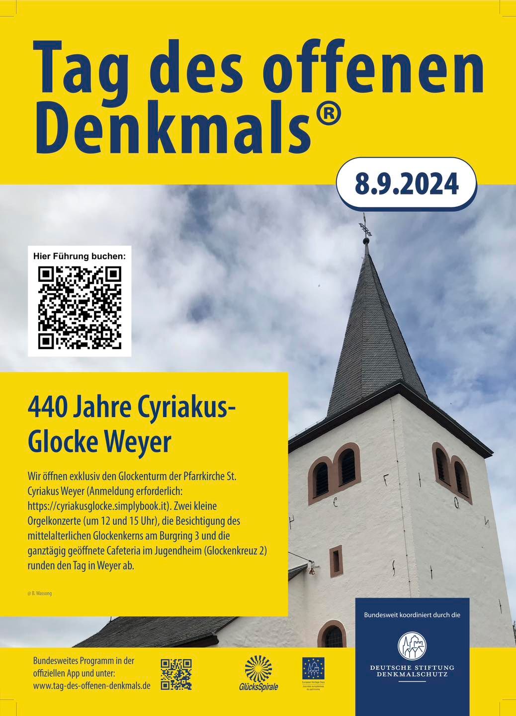 am Sonntag, den 08.09.24 macht der „Tag des offenen Denkmals“ erstmals Station in Weyer. Im Rahmen des 440-jährigen Jubiläums unserer Cyriakus-Glocke bieten wir in der Zeit von 9-18 Uhr exklusive und kostenlose Führungen in den Glockenturm unserer Kirche an. Die Cyriakus-Glocke ist ein bedeutendes Zeitzeugnis unseres Ortes und hat eine bewegte Geschichte. Trotz ihres hohen Alters läutet sie noch heute mindestens drei Mal täglich. Da der Aufstieg beschwerlich ist und über Leitern erfolgt, können wir nur mit kleinen Gruppen den Glockenstuhlerkunden. Um längere Wartezeiten zu vermeiden, bitten wir um Voranmeldung über die Internetadresse: https://cyriakusglocke.simplybook.it