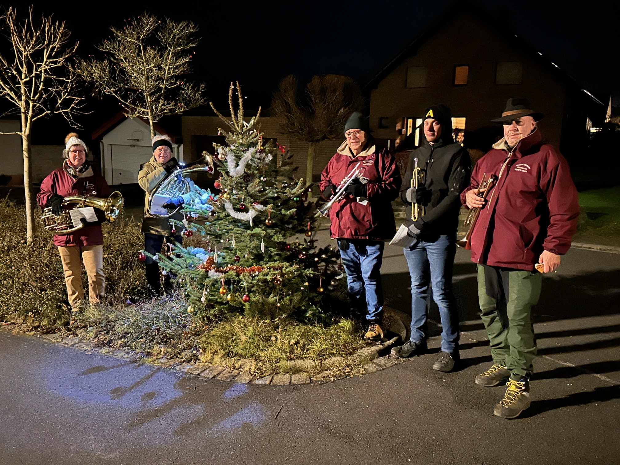 Viele liebevoll geschmückte Häuser und Vorgärten sorgten für eine besonders festliche Atmosphäre. Besonders hervor stach der liebevoll dekorierte Weihnachtsbaum am Rübenstück, der das Ortsbild wieder auf wunderbare Weise ergänzte. Ein kleiner Schnaps half den Musikern, schon mal zwischen den einzelnen Stücken aufzuwärmen, während sie unermüdlich weiter musizierten.