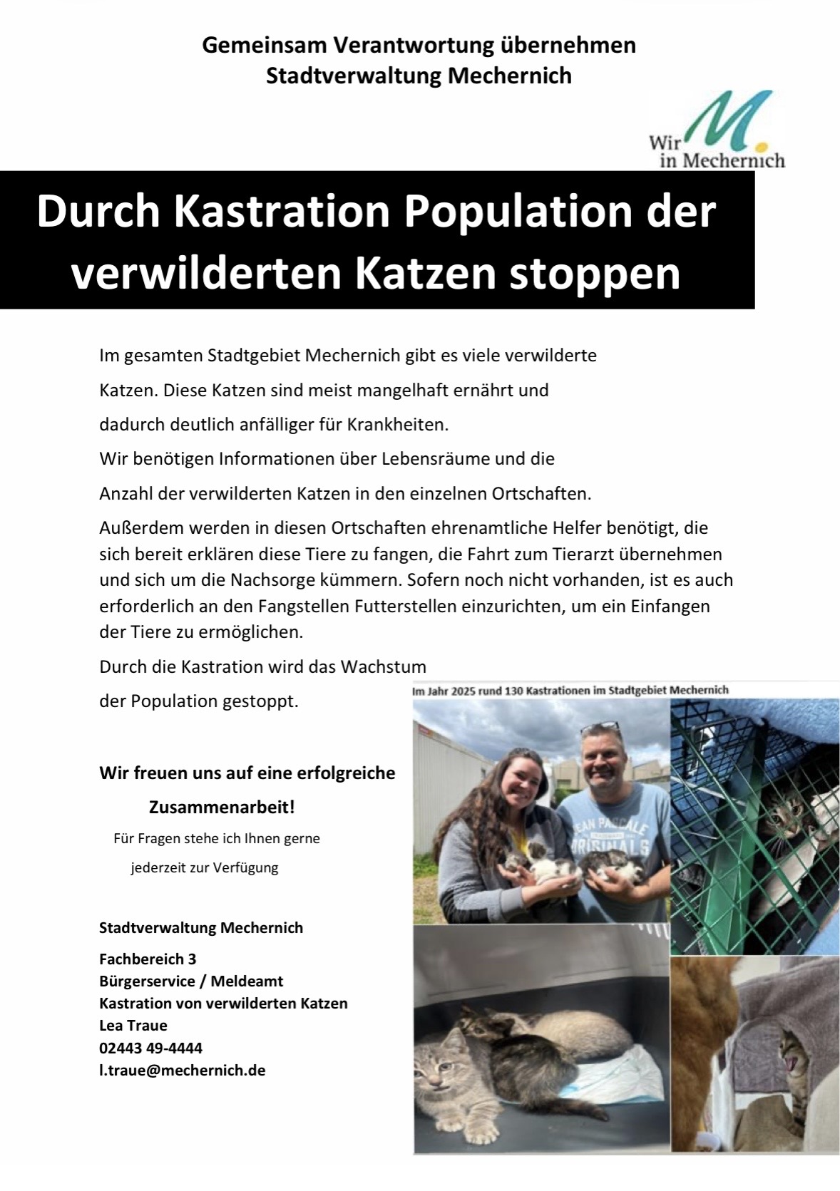 Dennoch scheint es im Stadtgebiet Mechernich viele verwilderte Katzen zu geben, die oft mangelhaft ernährt werden und dadurch anfälliger für Krankheiten sind.