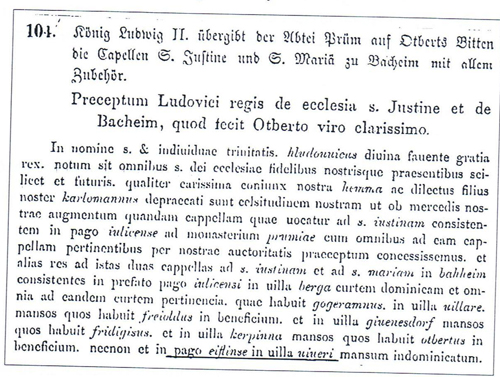 Erlaß des Königs Ludwigs über die Kirche S.Justine und über Bacheim, den für den Otbertus, einen sehr berühmten Mann gemacht hat. Im Namen der heiligen und unteilbaren Dreifaltigkeit. Ludwig, auf Grund der zuvorkommenden Gnade Gottes König. Bekannt sei allen Gläubigen der heiligen Kirche Gottes und selbstverständlich unseren gegenwärtigen und zukünftigen, auf welche Weise unser liebste Gattin Hemma und unser geschätzter Sohn Karlomannus sich an unseren hohe Haltung gewandt haben, daß wir für die Vermehrung unserer Zinsen eine Kapelle genannt hl.Justina, die im Jülicher Gau steht, durch Anordnung unserer Autorität der Abtei Prüm überlassen haben mit allem, was zu dieser Kapelle gehört. Und (auch) alle anderen Dingen, die zu jenen beiden Kapellen zur hl. Justina und zur hl. Maria in Bacheim gehören in dem vor genannten Jülicher Gau im Landgut Berga einen Königshof und alles, was sich auf diesem Hof bezieht. Dieses hat Gogeramnus gehabt. Auf dem Landgut Uillare die Hufe, die Freioldus zum Lehen gehabt hat. Und auf dem Gladgut Giuenesdorf die Hufen, die Gridigisus gehabt hat. Und auf dem Landgut Kerminna die Hufen, die Otbertus zum Lehen gehabt hat. Und im Eifelgau auf dem Landgut Uiueri eine herrschaftsfreie Hufe und alles was sich auf die Hufe selbst bezieht.