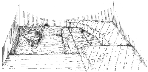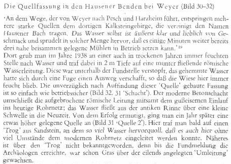 Dort grub man im Jahre 1938 an einer auch in trockenen Jahren immer feuchten Stelle nach Wasser und traf dabei in 2m Tiefe auf eine munter fliesende römische Wasserleitung. Diese war unterhalb der Fundstelle verstopft, das gehemmte Wasser hatte sich durch eine Fuge einen Ausweg verschafft, so dass die Wiese hier immer feucht blieb. Die unverzüglich nach Auffindung dieser Quelle gebaute Fassung ist so einfach wie betriebssicher (Bild 32,31"Schacht"). Der moderne Betonschacht umschließt die aufgebrochene römische Leitung mitsamt dem gusseisernen Einlauf ins heutige Rohrnetz; das Wasser fließt aus der antiken Rinne über eine kleine Schwelle in die Neuzeit. Von dem Erfolg ermutigt, ging man ein Jahr später eine etwas höher gelegene Quelle an (Bild 31"Quelle 2"). Hier traf man bald auf einen Trog aus Sandstein, an dem so viel Wasser hervorquoll, das es auch hier ohne viel Umstände dem modernen Rohrnetz eingeleitet werden konnte.Näheres ist über den Trog nicht bekanntgeworden, denn bis die Fundmeldung die Archäologen erreichte, war schon Gras über der eilends angelegten Umleitung gewachsen.