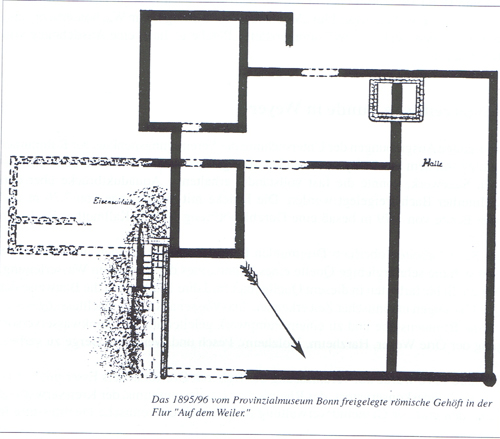 Die Überreste eines neben dem Hof befindlichen, mit Steinen überdeckten Windkanals und die dabei vorgefundenen Eisenschlacken belegen, daß der ehemalige Besitzer hier eine Eisenschmelze betrieben hat. Südöstlich, getrennt vom Gehöft, legte man einen kellerartigen Raum, in dem eine Treppe aus acht noch gut erhaltenen Stufen hinabführte, frei. Die gefundenen Münzen und Gefäßscherben ordnen die Anlagen dem 4 Jahrhundert n.Chr. zu.