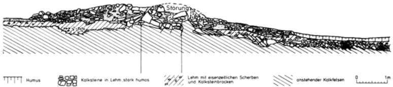 Überraschend war, dass unter dem Hügel eine wenige Zentimeter dicke Lehmschicht folgte, die sich offensichtlich unter dem gesamten Hügel und seinem Umfeld erstreckt. Sie enthält Keramikbruch der Stufe Hallstatt C/D sowie Schlacken und Eisenerz. Aus dieser Schicht stammen auch wenige Eisenteile, die ihrer Form nach zu einer Radnabe gehören könnten.
