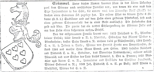 Dies ist das Wappen des Johann Crümmel von Nechtersheim (Nettersheim). Die Burgherren von Weyer hatten keine männlichen Nachkommen mehr und verheirateten ihre Tochter Alverada mit Johann Crümmel von Nechtersheim. Diese werden im Jahre 1465 als Erbe des ganzen Besitzes genannt. Bis 1636 waren die von Nechtersheim mit Weyer belehnt.