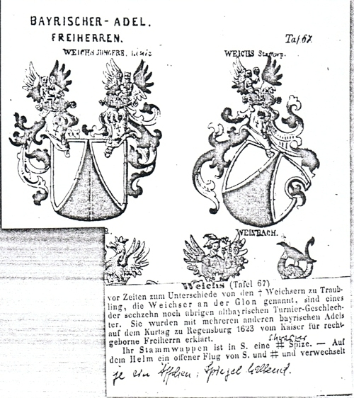 Vor Zeiten zum Unterschiede von den den Weichsern ✝ zu Traubling, die Weichser an der Glon genannt, sind eines der sechzehn noch übrigen altbayrischen Turnier-Geschlechter. Sie wurden mit mehreren anderen bayrischen Adels auf dem Kurtag zu Regensburg 1623 vom Kaiser für rechtgeborene Freiherrn erklärt.