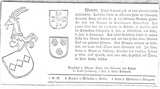 Dies ist das Wappen derer von Weyer (Wiere) Im Jahre 1372 wurde das Geschlecht von Weyer vom Erzbischof Friedrich III. von Köln mit Weyer belehnt. Weitere Belehnungen von derer von Weyer sind für die Jahre 1417, 1451 und 1481 nachgewiesen.