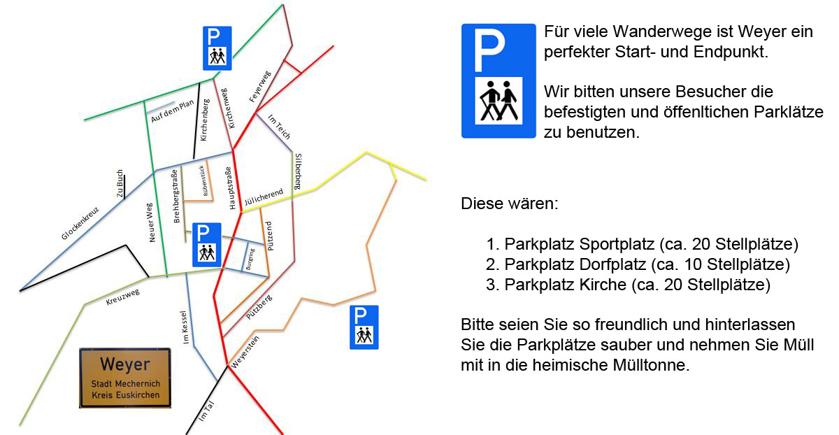 Neben viel Ortsgeschichte führt der Weg auch am geografischen Mittelpunkt des Kreises Euskirchen vorbei, welcher sich am Ortsrand von Weyer befindet. Auch wenn diese Informationstafel nicht genau auf dem Punkt aufgestellt wurde, hier soll auch weiterhin der Landwirt in Ruhe sein Feld bestellen können und die Natur Ihren Raum behalten.